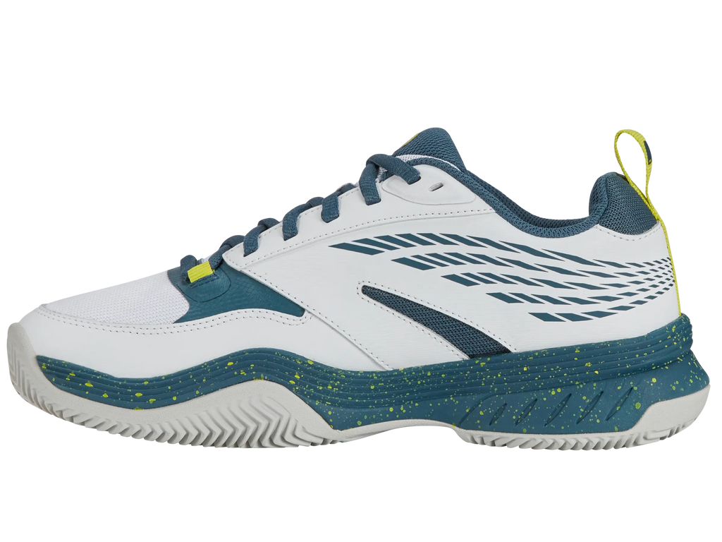 The K-Swiss Speedex Padel Shoe. Breathable mesh upper is reinforced with hot melt TPU film and synthetic leather combination panels for lightweight protection and support. A compression-molded K-EVEA midsole gives a cushioned ride, while the Aosta 7.0 rubber outsole with a herringbone pattern provides superior traction on various Padel court surfaces.
