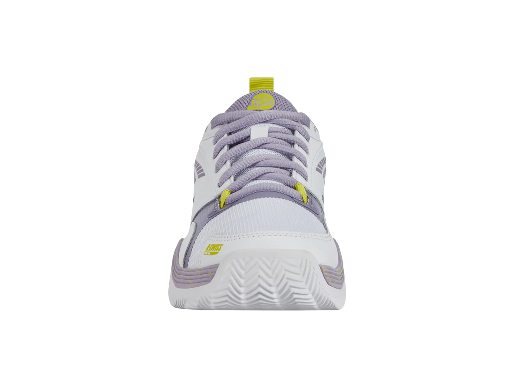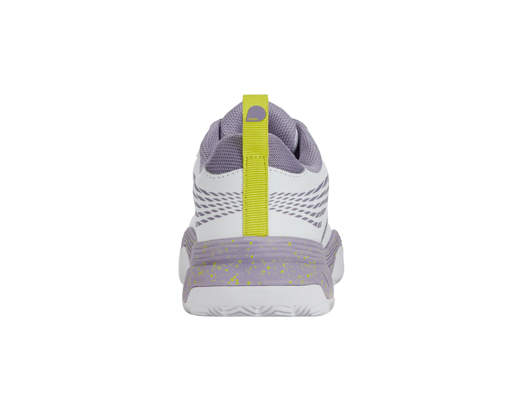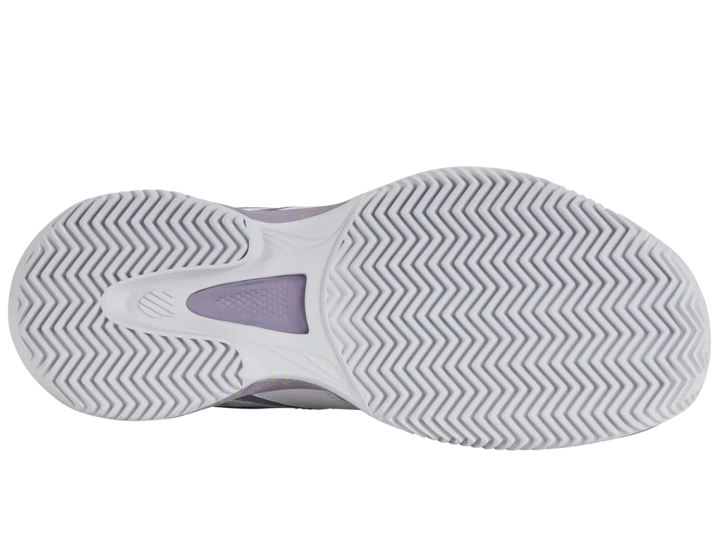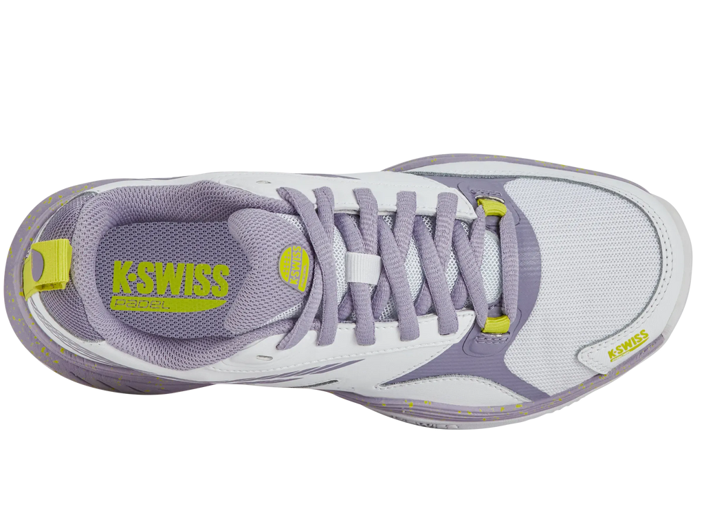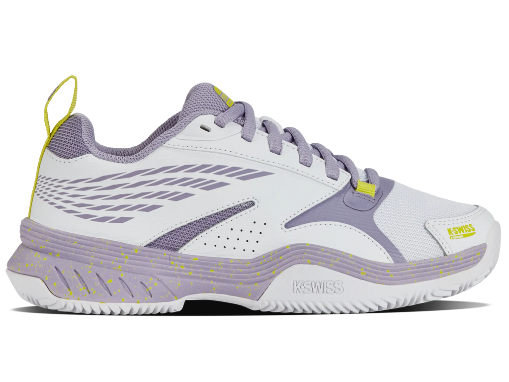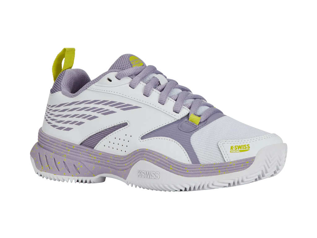 K-Swiss Speedex Womens Padel Trainer. Breathable mesh upper is reinforced with hot melt TPU film and synthetic leather combination panels for lightweight protection and support. A compression-molded K-EVEA midsole gives a cushioned ride, while the Aosta 7.0 rubber outsole with a herringbone pattern provides superior traction on various Padel court surfaces.