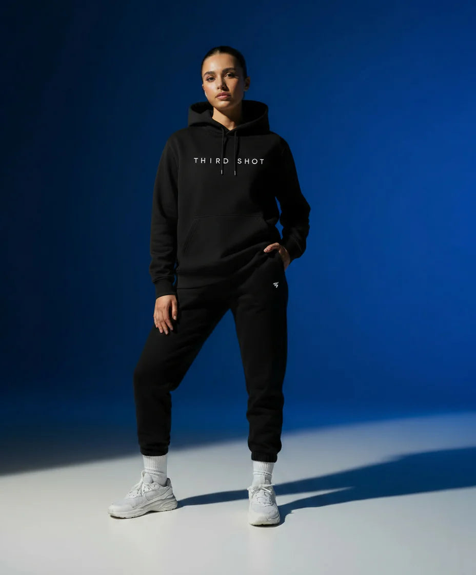 Heavyweight hoodie with “THIRD SHOT” text printed across the chest. Made from a thick, premium cotton blend for warmth, comfort, and durability. Features a front pouch pocket and adjustable drawstring hood.