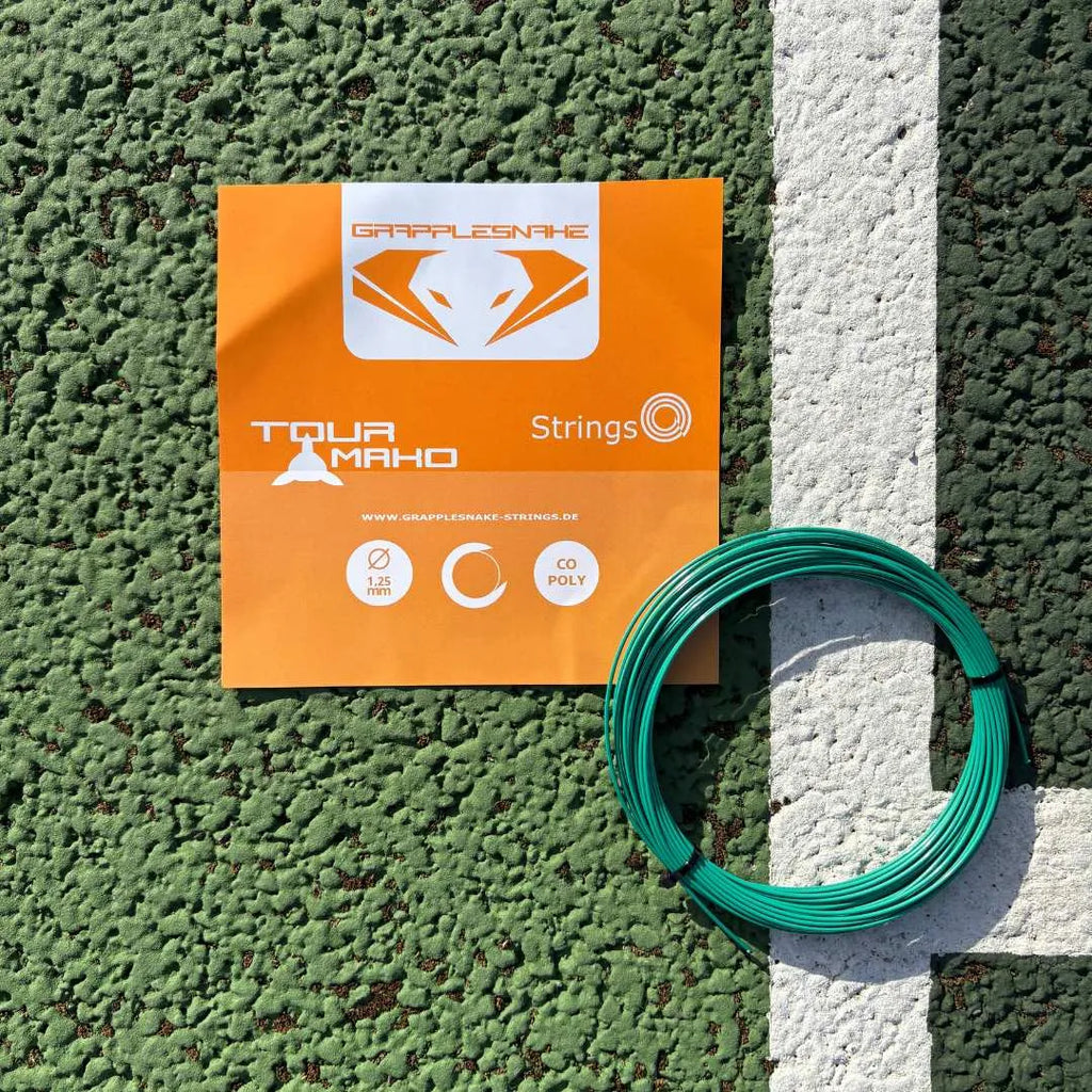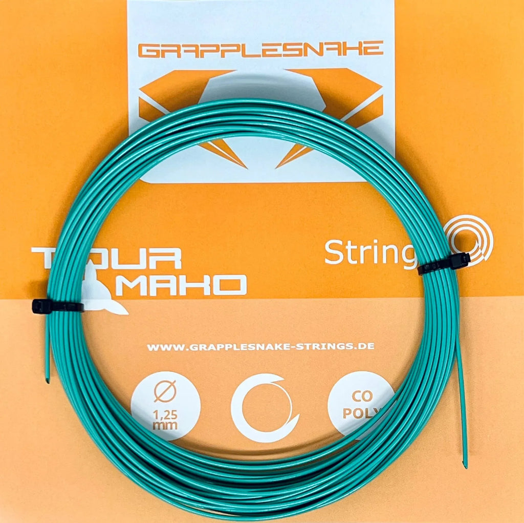 Grapplesnake Tour Mako. Following the success of Tour M8 and the use of novel materials in Paradox Pro, we decided to combine their biggest individual strengths into one string. Mako is stable, consistent, durable and reliable, as Tour M8. And just like Paradox Pro, it utilizes new additives to increase playability and feel. These additives are new to the tennis string industry, and, unlike Paradox Pro, they are non-metallic. They aid in feel, durability and provide Tour Mako with a mildly abrasive surface. We believe in a consistent and predictable launch for this Tour level string, which is why we have chosen a round shape. At the same time, we provided the surface with mild abrasion, which allows for increased spin potential while retaining consistency.